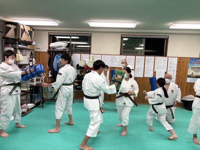 さらにキックミットをめがけての振突。腕だけを使う突きと、身体を捻った突き、そして股関節をたたむようにした突きを体感してもらいました。振突きへの応用は少し難易度が上がるので、全員実感できたとは言えませんが、今後の技術の向上に繋がっていくと思われます。