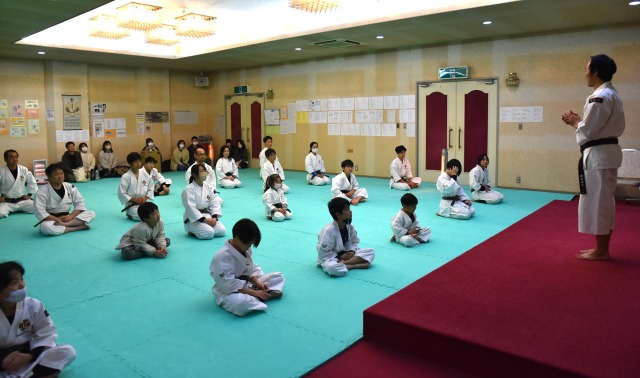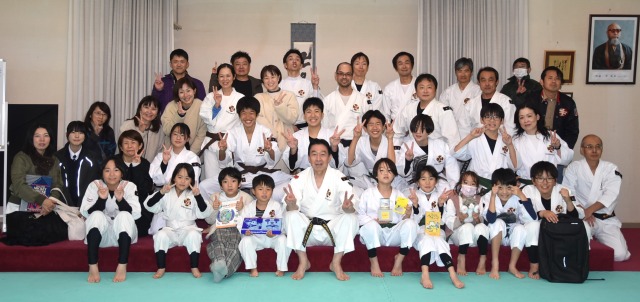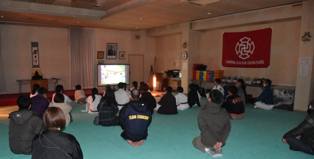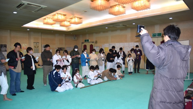 鎮魂行、基本演練、1年間の活動記録の上映、ビンゴ大会、記念撮影、来年のカレンダー配布の流れはいつも通りですが、来週、本山・本部で特別昇格考試を受験するO副道院長に、受験前の意気込みも語ってもらいました。